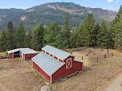 Welcome to this inviting 3 bed, 2 bath home set on 16 acres with sweeping lake, valley, and sunset views. Inside you'll find an open floor plan with two bedrooms and a full bath on one side, and a private primary suite with attached bath on the other. Enjoy cozy evenings by the wood stove, with the comfort of a furnace and community water system. Outside you will love the covered porch, a fenced 21x47ft garden featuring established raspberries, strawberries, blueberries, and rhubarb plus an apple, cherry, plum, and pear tree, as well as lilac bushes. The property also includes a charming red-and-white barn with attached corral, perfect for small animals, a chicken coop and a storage shed. Offering the peace and privacy of country living, this property is a true gem.